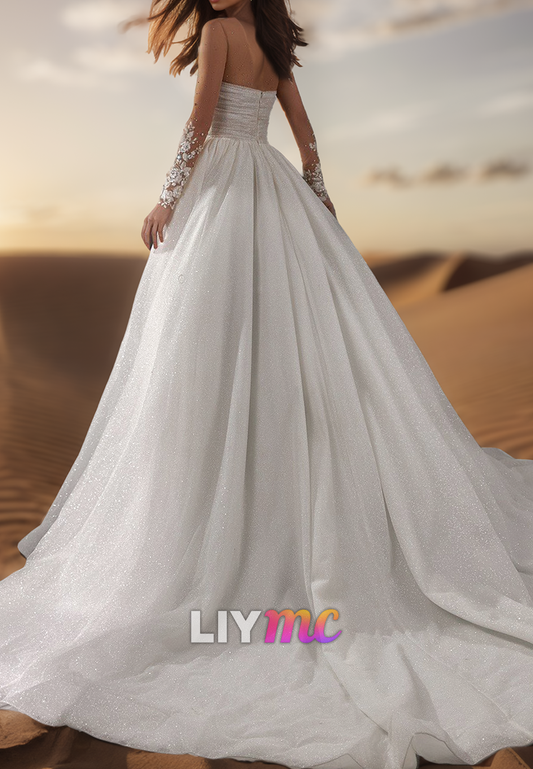 Sweetheart Long Sleeves Beaded Pleatedd Ball Gown Wedding Dress