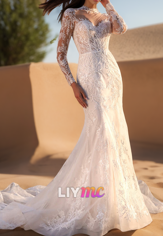 High Neck Long Sleeevs Lace Appliques Mermaid Wedding Dress