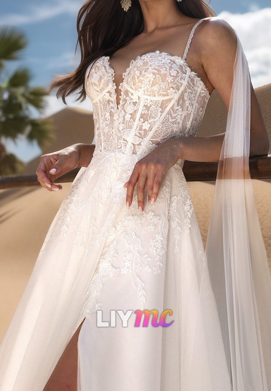 V-Neck Floral Embellished Side Slit Spaghetti Straps Beach Wedding Dress