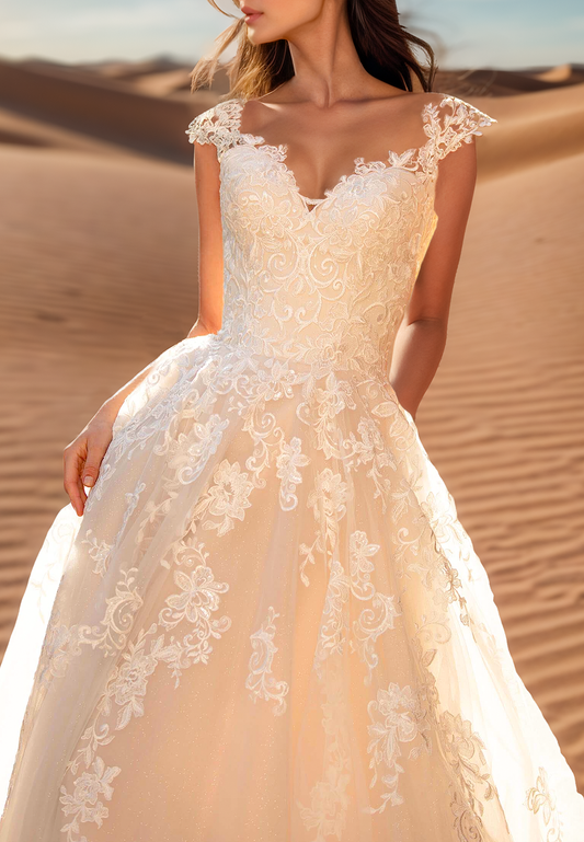 V-Neck Cap Sleeves Lace Appliques Ball Gown Wedding Dress