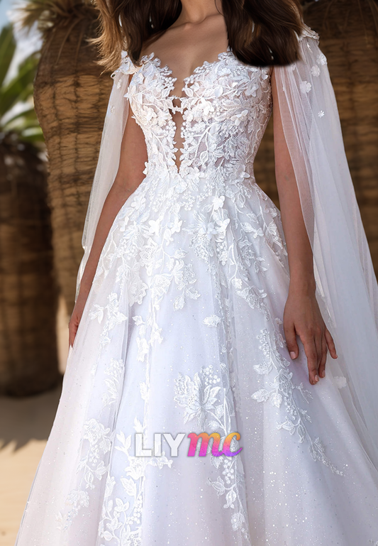 V-Neck Cap Sleeves Appliques Tulle A-Line Wedding Dress