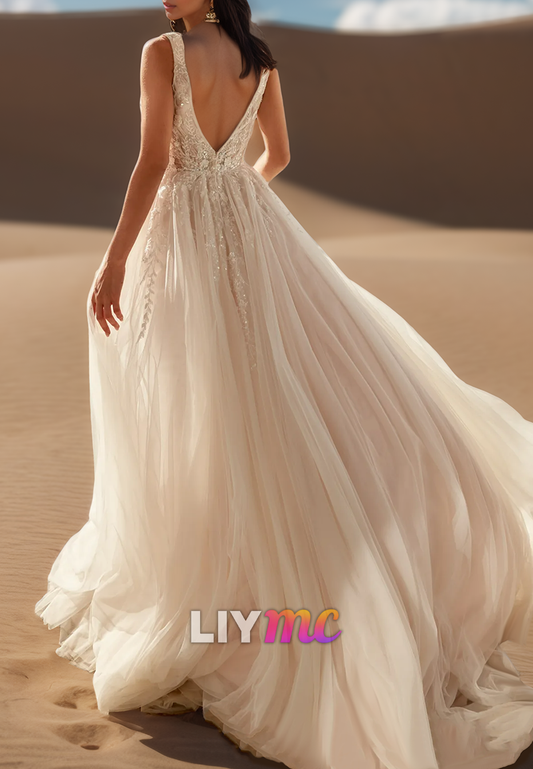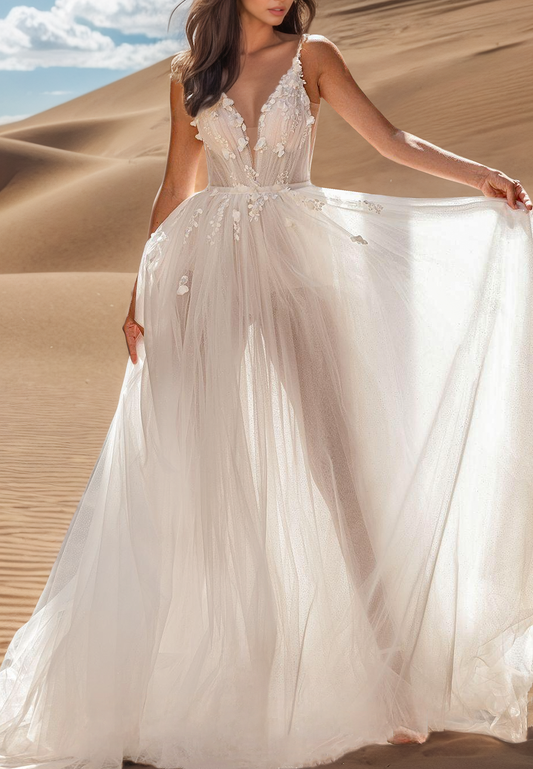 V-Neck Straps Appliques Tulle A-Line Boho Wedding Dress
