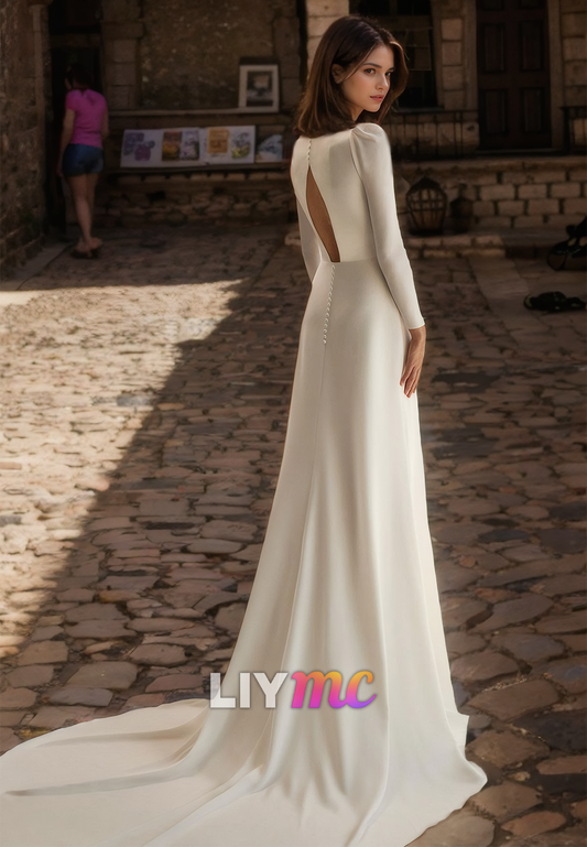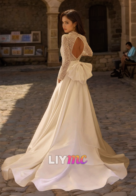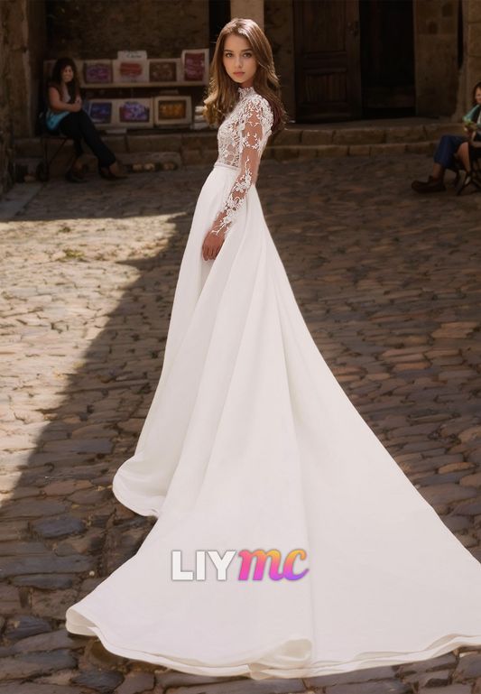 High Neck Long Sleeves Appliques Sleek A-Line Wedding Dress