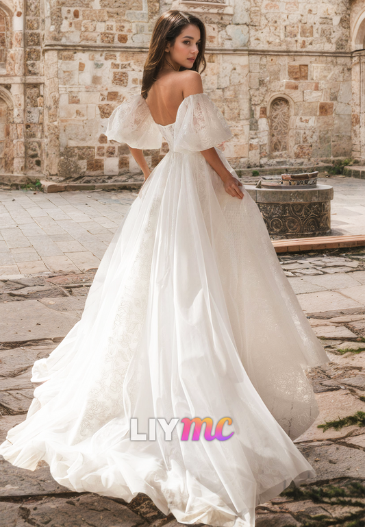 Off-Shoulder Puff Sleeves Appliques A-Line Ball Gown Wedding Dress