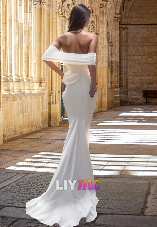 Off-Shoulder Sleeveless Ruched Pleated Side Slit Sheath Beach Wedding Dress