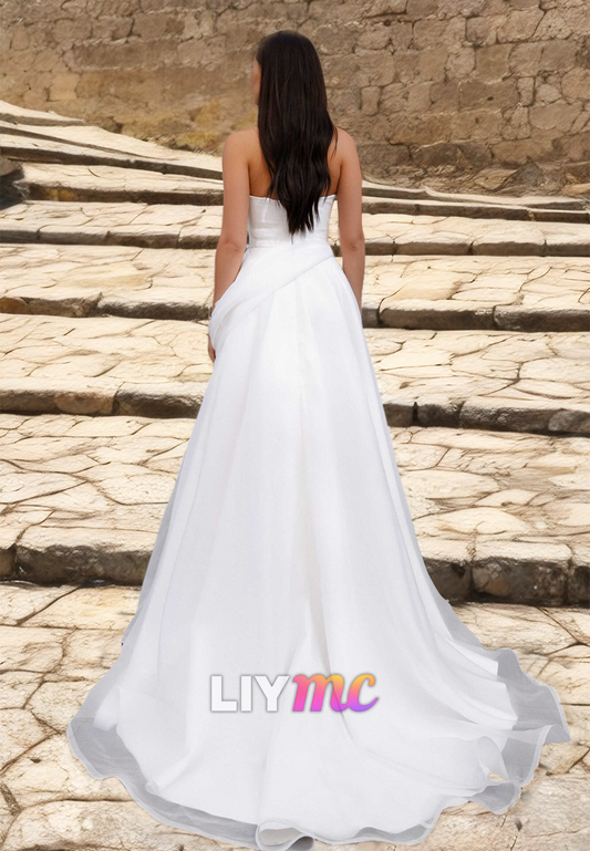 V-Neck Strapless Pleated Side Slit A-Line Beach Wedding Dress