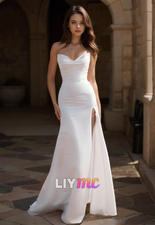 Off-Shoulder Strapless Ruched High Slit Simple Beach Wedding Dress