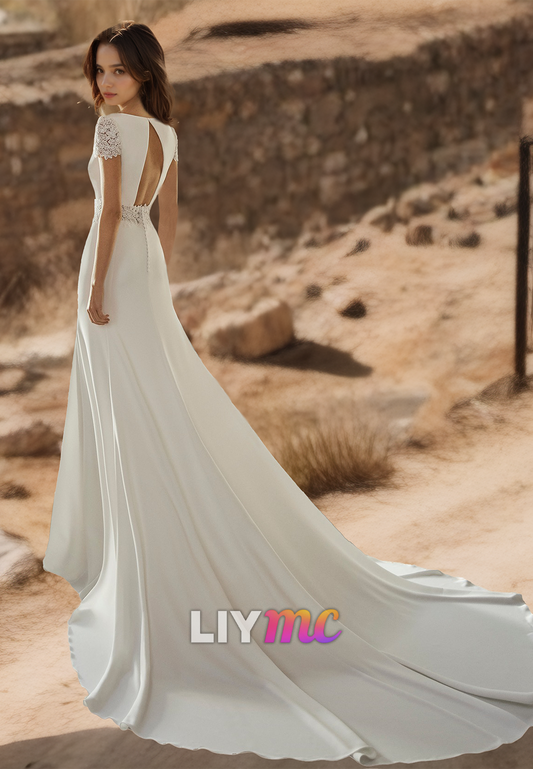 Square Cap Sleeves Lace Appliques Sleek A-Line Wedding Dress