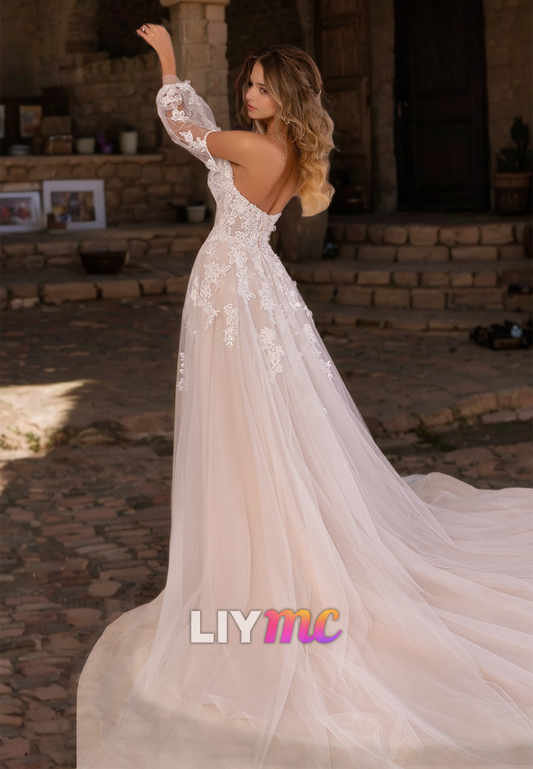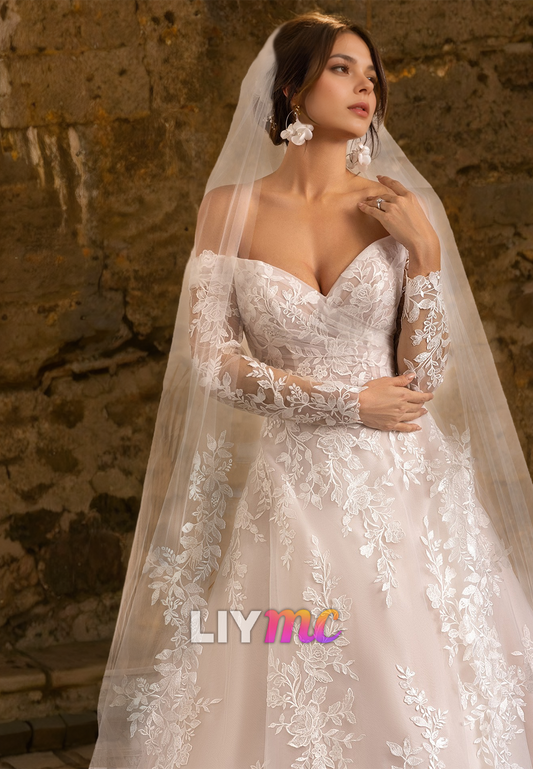 Sweetheart Long Sleeves Floral Appliques Tulle A-Line Wedding Dress