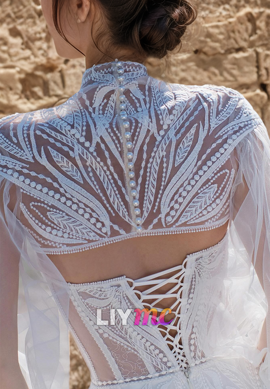 High Neck Long Sleeves Lace Appliques Sleek Mermaid Wedding Dress