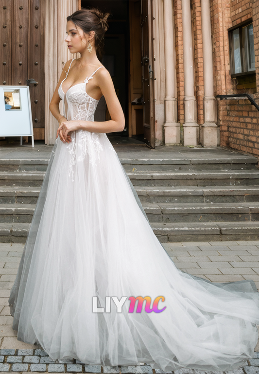 Sweetheart Spaghetti Straps Tulle Floral Appliques A-Line Wedding Dress