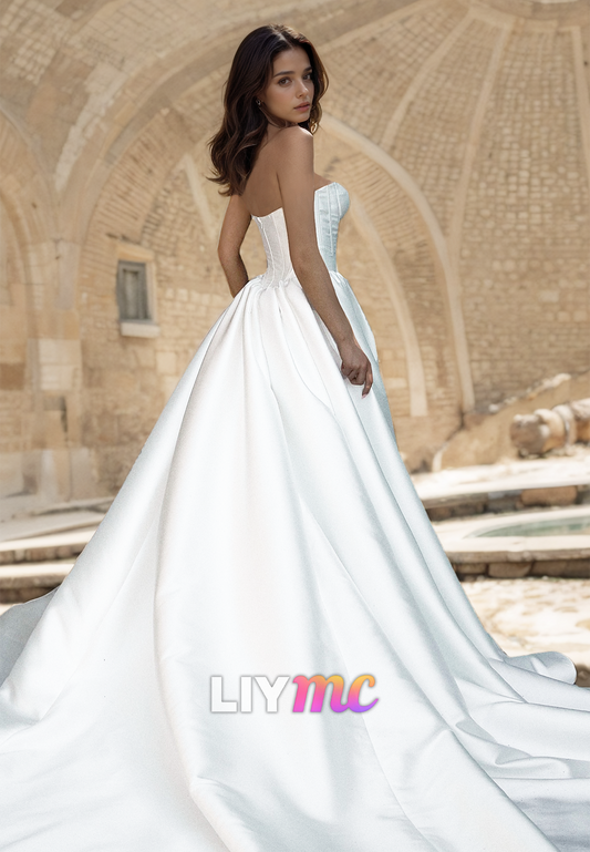 Sweetheart Strapless Pleated Satin A-Line Simple Wedding Dress
