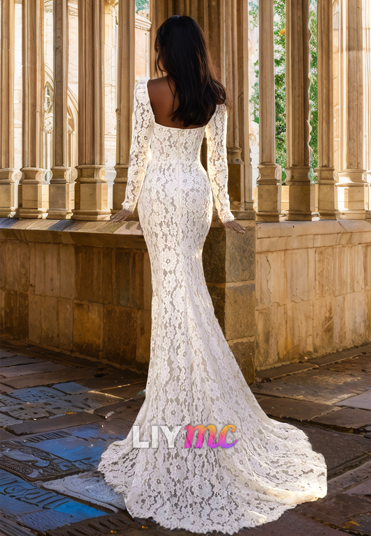V-Neck Long Sleeves Lace Appliques Sleek Mermaid Wedding Dress