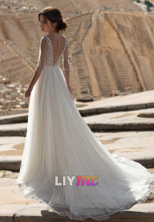 V-Neck Cap Sleeves Beaded Tulle A-Line Sparkly Wedding Dress