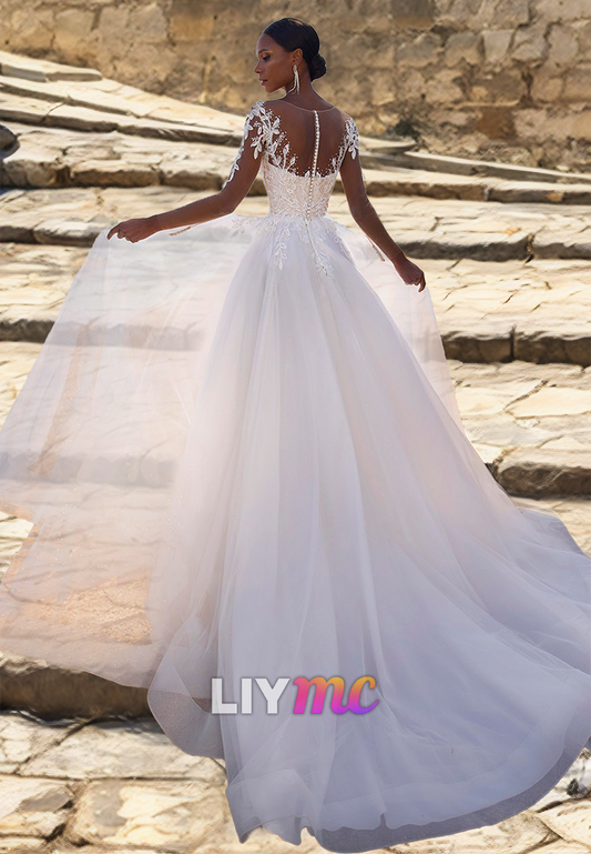 V-Neck Long Sleeves Appliques Tulle A-Line Wedding Dress