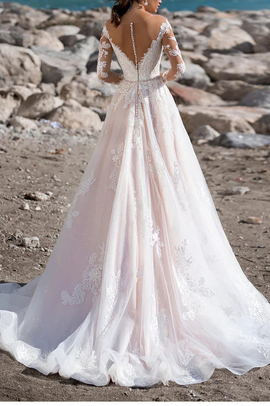 A-line illusion collar lace decal long sleeved plain wedding dress