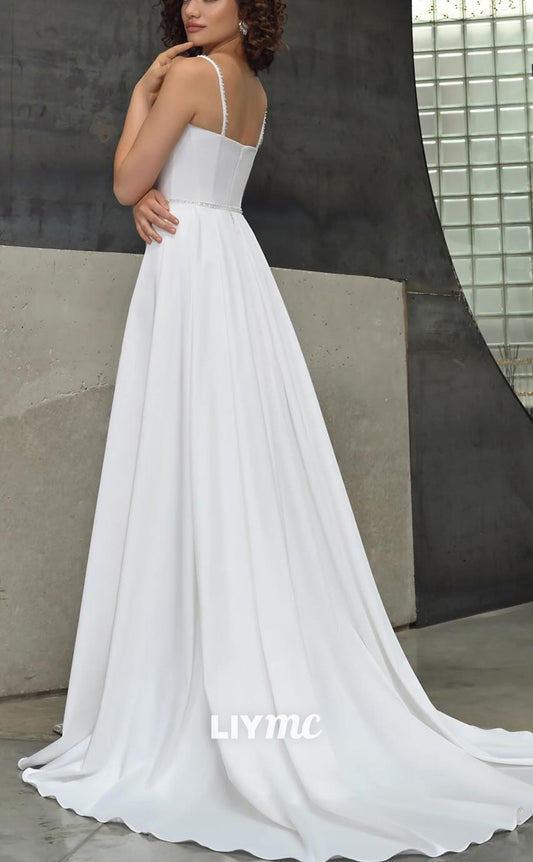 LW892 - Sweetheart Spaghetti Straps Sleek Satin Pleated High Slit Beach Wedding Dress