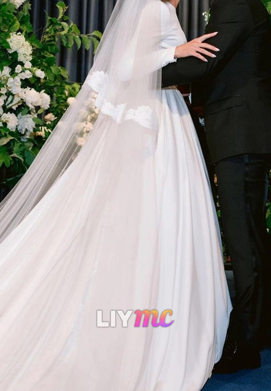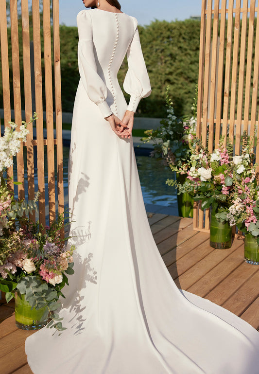 LW690 - Square Long Sleeves Sleek Satin Sheath Beach Wedding Dress