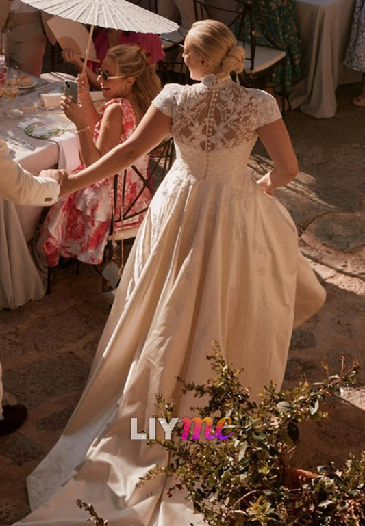 High Neck Short Sleeves Appliques A-Line Wedding Dress