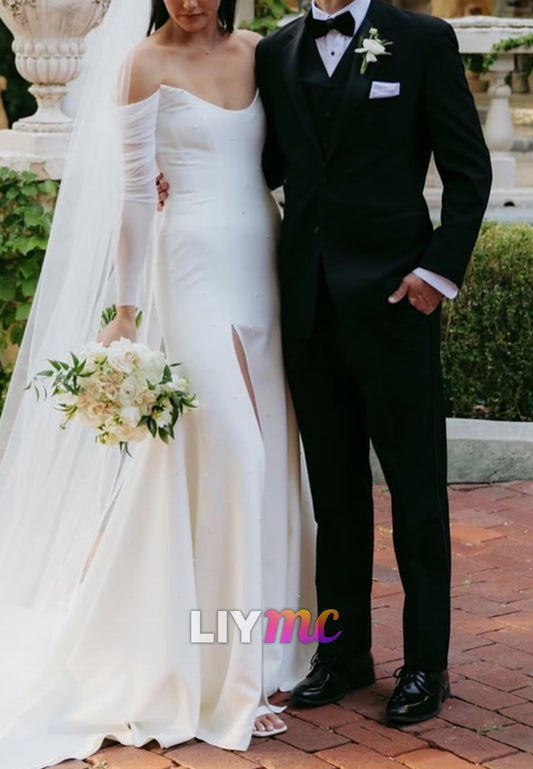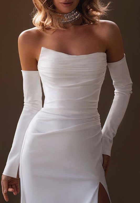 Off-Shoulder Strapless Ruched High Slit Satin Wedding Dress