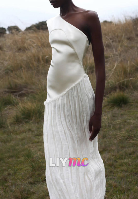 One Shoulder Sleeveless Pleated Sleek Sheath Beach Wedding Dress