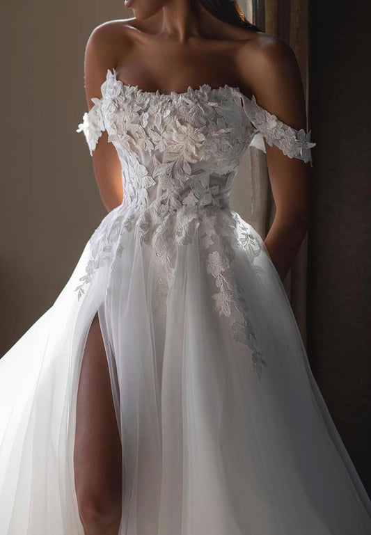 Off-Shoulder Floral Appliques Ball Gown Wedding Dress