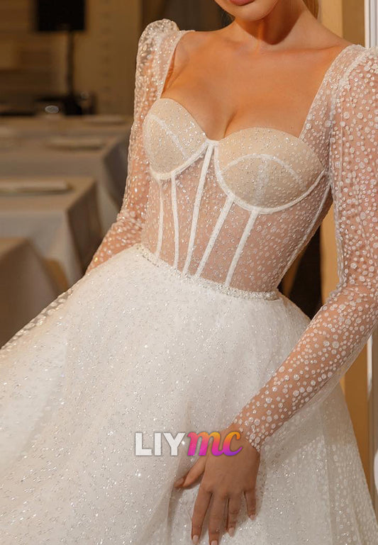 Sweetheart Long Sleeves Sparkly Ball Gown Wedding Dress