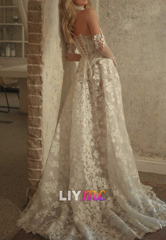 LW694 - Off-Shouler Lace-Up A-Line Side Slit Beach Wedding Dress