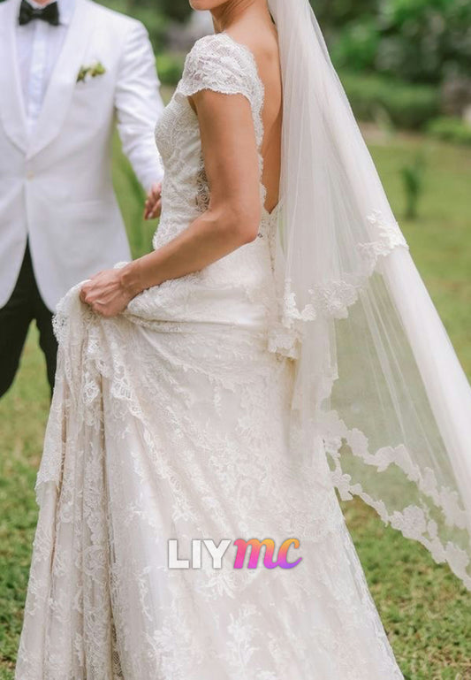 V-Neck Cap Sleeves Lace Appliques A-Line Boho Wedding Dress