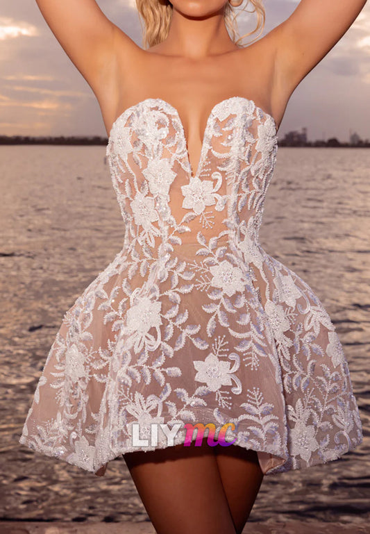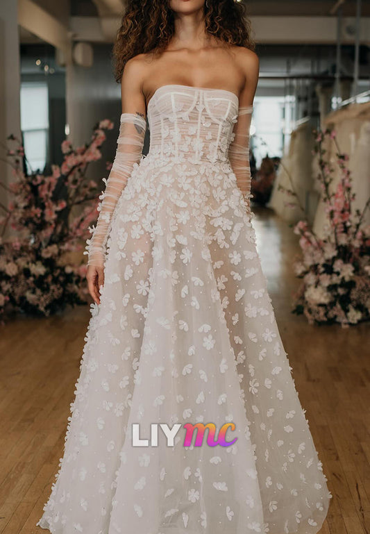V-Neck Strapless Floral Appliques A-Line Wedding Dress