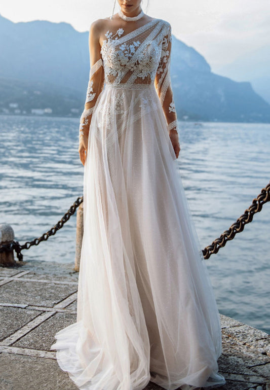 One Shoulder Long Sleeves Lace Appliques Tulle A-Line Wedding Dress