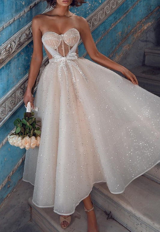 Sweetheart Strapless Tulle Sparkly A-Line Beach Wedding Dress