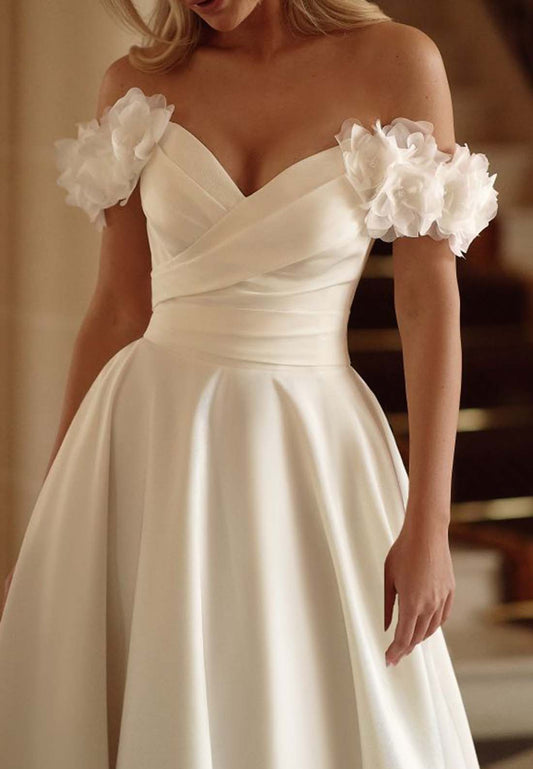Off-Shoulder Sleeveless Pleated Satin A-Line Short Wedding Dress