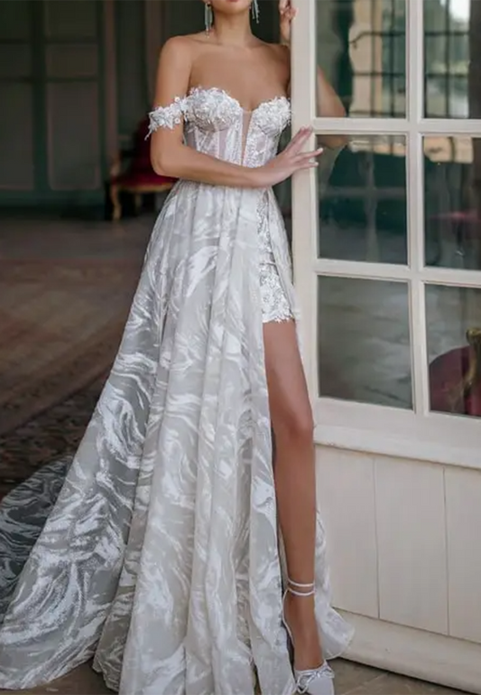 Off-Shoulder Sleeveless Floral Appliques High Slit A-Line Beach Wedding Dress