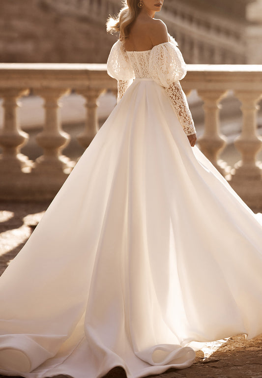Off-Shoulder Lace Appliques A-Line Satin Wedding Dress