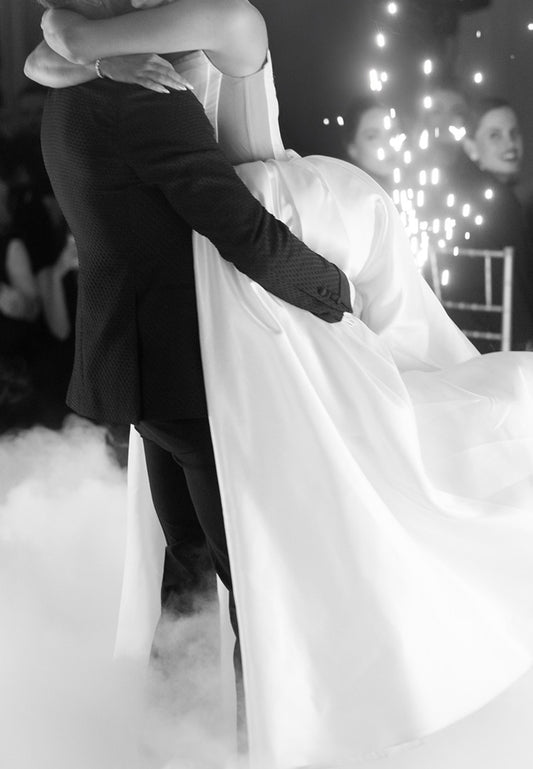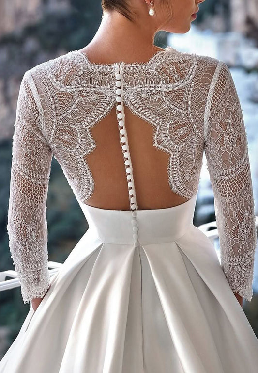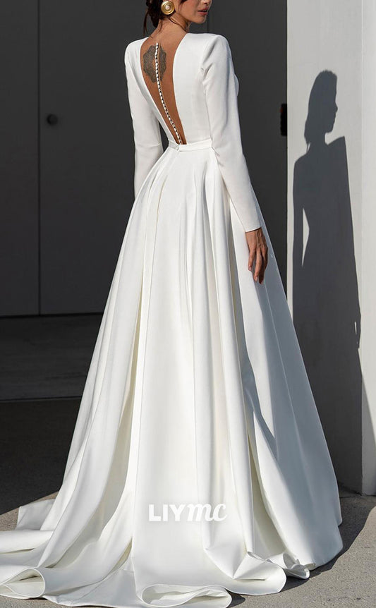 LW851 - Low V-Neck Long Sleeves Pleated Satin A-Line Wedding Dress