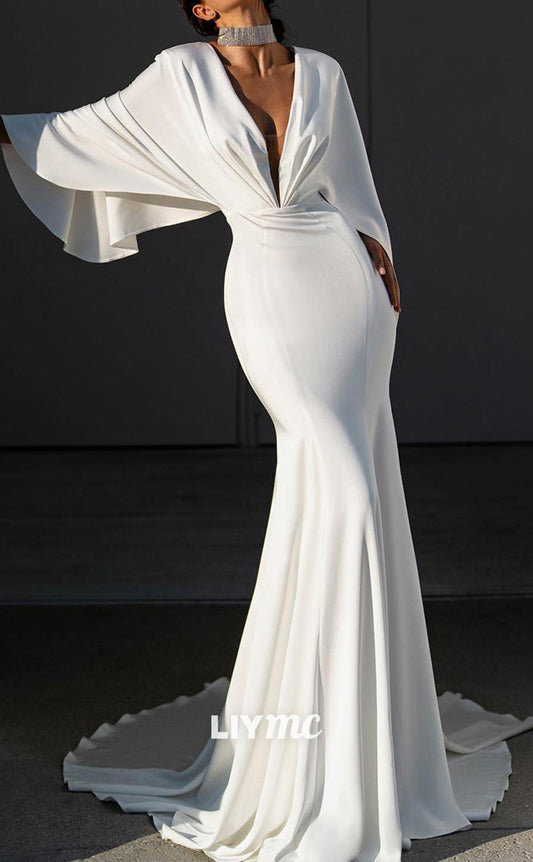 LW852 - Low V-Neck Long Sleeves Pleated Sleek Satin Mermaid Beach Wedding Dress