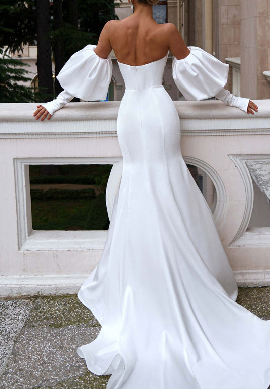Off-Shoulder Puff Sleeves Pleated Sleek Mermaid Beach Wedding Dress
