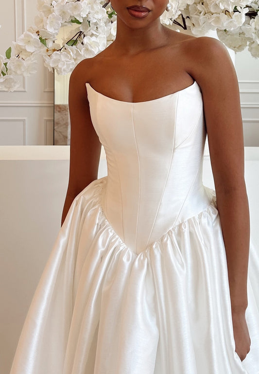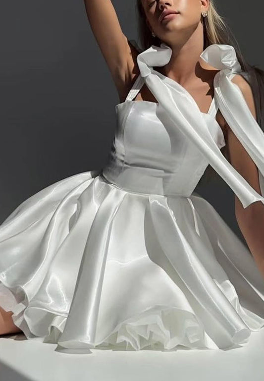 LW139 - A Line Square Neck Pleated Satin Mini Wedding Dress