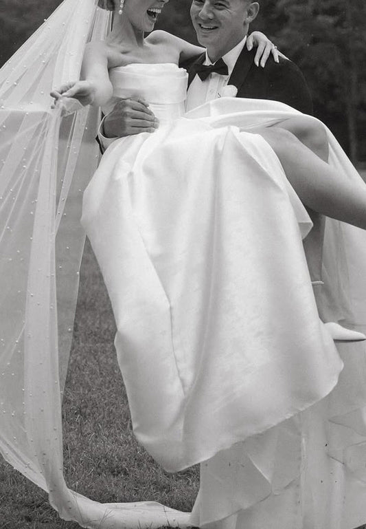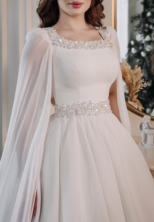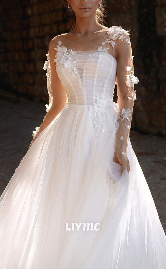 LW868 - Straight Across Sheer Sleeves Floral Embellished Pearl Beaded A-Line Wedding Dress