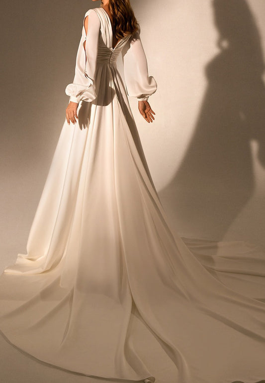 V-Neck Long Sleeves Pleated High Slit A-Line Beach Wedding Dress