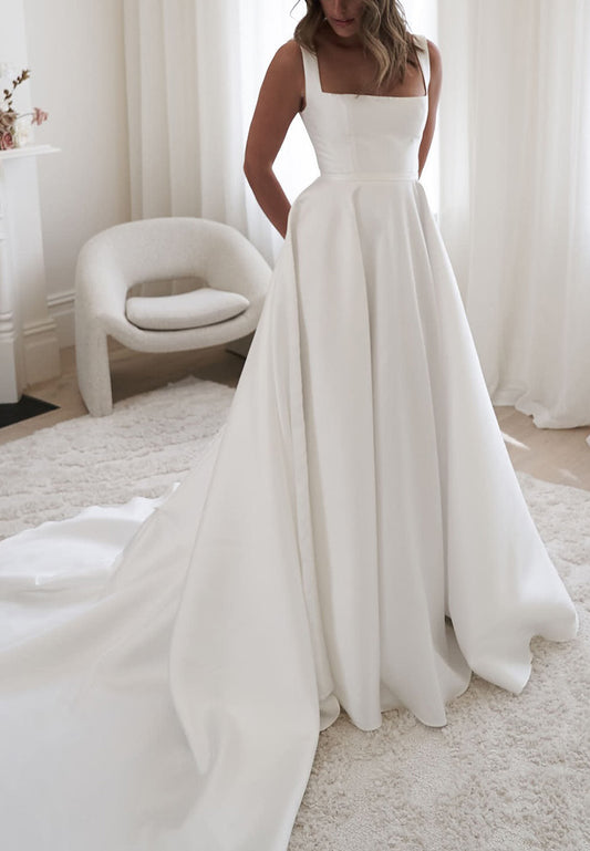 Square Sleeveless Sleek A-Line Satin Wedding Dress