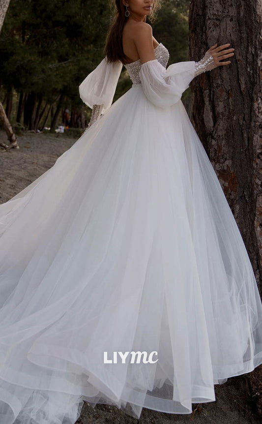 LW867 - Sweetheart Puff Sleeves Pearls Beaded Sequins A-Line Wedding Dress