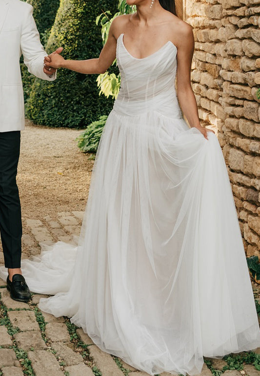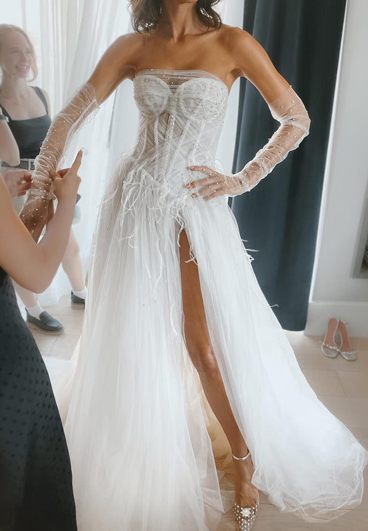 LW132 - A Line Strapless Sheer Pleated Tulle Feather Long Wedding Dress With Side Slit