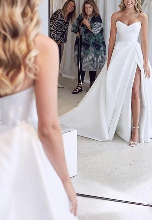 LW858 - Sweetheart Strapless Pleated Bowknot High Slit Pleated A-Line Beach Wedding Dress