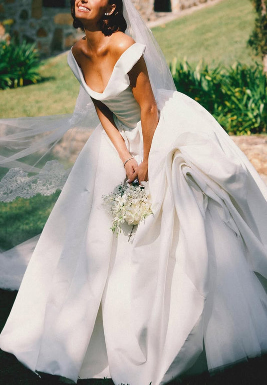 Off-Shoulder Pleated Satin Sleek Sleeveless A-Line Wedding Dress