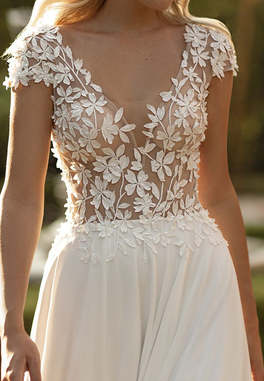 V-Neck Cap Sleeves Appliques Side Slit A-Line Beach Wedding Dress
