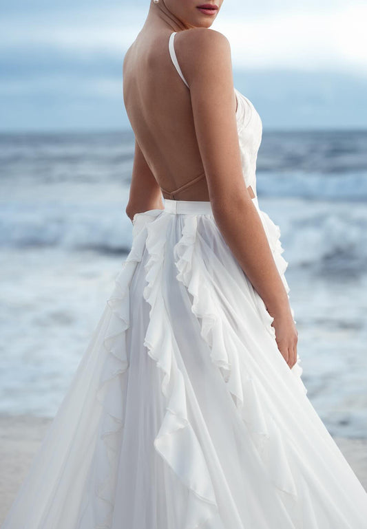 V-Neck Spaghetti Straps Appliques Chiffon A-Line Boho Wedding Dress