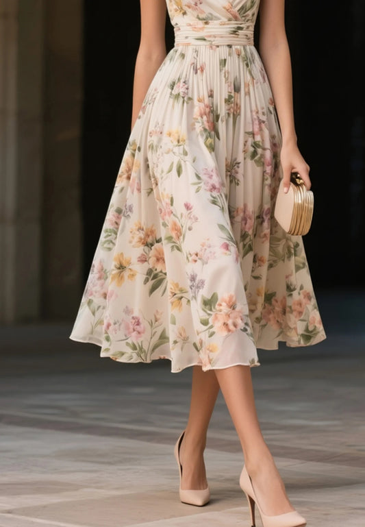 Beige Ruched Floral Chiffon V Neck Sleeveless A-Line Midi Dress