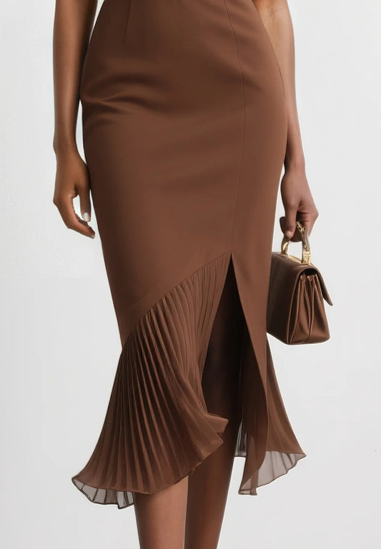 Brown Pleated Slit Classic Boat Neck Sleeveless Mermaid Midi Dress